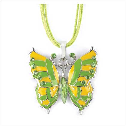 Breathe the brightness of springtime into any ensemble by adding this darling butterfly! Cheerfully colored pendant get extra sparkle from faceted "gems", tastefully trimming a matching cord necklace. Pewter pendant; fabric necklace. Necklace: 10 1/2" long. Pendant: 1 1/2" x 1/2" x 2" high. (1 EA) WFM-38226 JEWELRY, PENDANTS