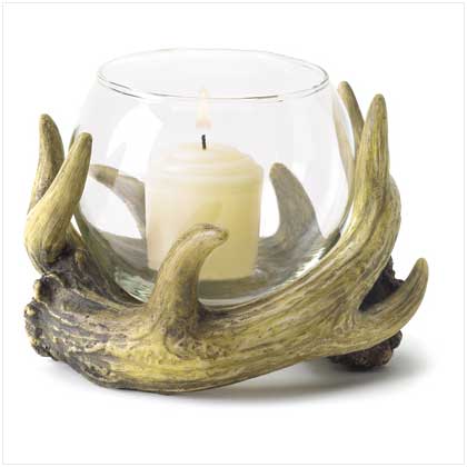 RUSTIC ANTLER CANDLEHOLDER Rustic "antler" wreath forms a crafty cradle for a glass globe votive holder. A wonderfully woodsy touch of nature to warm up your cabin-style or country decor! Polystone with glass cup. Candle not included. 5 3/8" x 4 7/8" x 3 5/8" high. (1 EA) WFM-38444 Retail $9.95 to $13.95 Wholesale Price $4.65 "Web Only" Below Wholesale Price $4.52