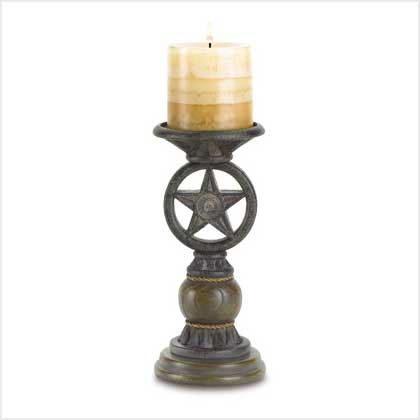WESTERN STAR CANDLEHOLDER The Lone Star forms a charming centerpiece for this countrified candleholder. Homespun touches include weathered wood-look and faux-iron finishes, and clever carved "fencepost" base. An instant bit of barnyard charm! Polyresin and metal. 3 3/4" diameter x 8 1/2" high. Candle not included. (1 EA) WFM-38451 Retail $14.95 to $20.95 Wholesale Price $7.00 "Web Only" Below Wholesale Price $6.75