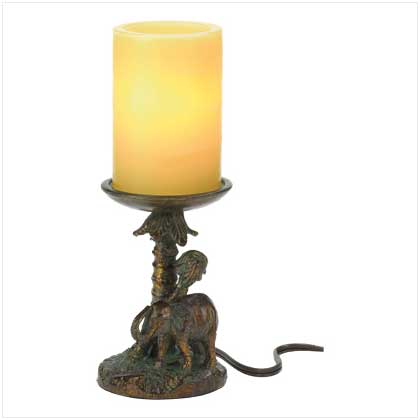 SAFARI CANDLE LAMP Safely enjoy the magic of candlelight most anywhere! Clever lamp boasts a real wax shade, casting the cozy ambience of a real-live candle with no dangerous open flame or messy dripping wax. Sculpted base in rich verdigris copper finish features a charming miniature elephant-and-palm-tree jungle scene. Polyresin base; wax shade. 4-watt bulb included. UL approved cord. 4" diameter x 11" high. (1 SET) WFM-38592 Retail $34.95 to $48.95 Wholesale Price $16.70 "Web Only" Below Wholesale Price $16.13