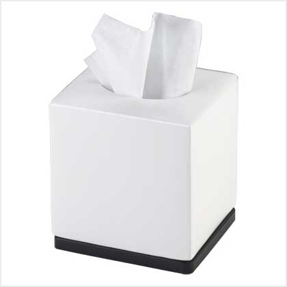 BOUTIQUE TISSUE BOX Keep facial tissues nearby and elegantly displayed in this timelessly tasteful ceramic cover. Basic white cover and black wood base allow effortless blending with any decor. Pop-up tissue window at top. Ceramic with wood base. 6" square x 6" high. (1 EA) WFM-38731 Retail $14.95 to $20.95 Wholesale Price $6.95 "Web Only" Below Wholesale Price $6.68