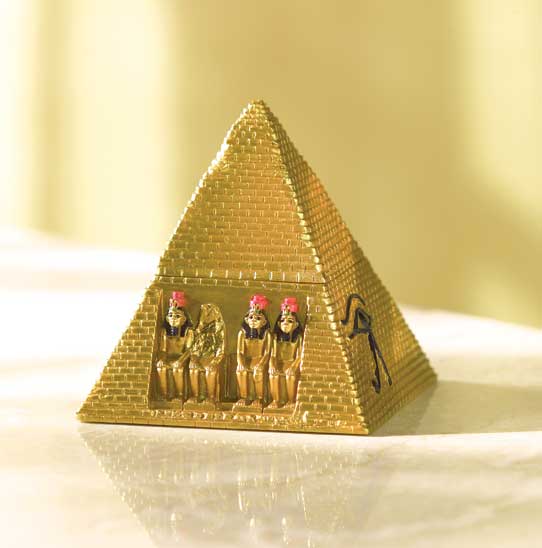 GOLDEN PYRAMID TRINKET BOX (37770) Lift the hinged top of this gleaming gilded pyramid to reveal a secret spot to stash your royal treasures! Exactingly modeled after the Great Pyramids of Egypt, complete with figural carvings and tiny heiroglyphs. Polyresin. 4" x 4" x 4 3/4" high. 1 EACH $14.95 (page 84) |