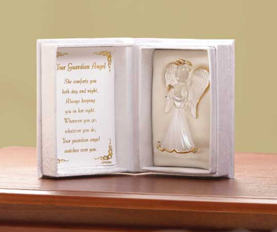 A soft satin box holds a delicately detailed, 22K gold accented glass angel and a stirring poem about guardian angels. A touching and unique gift. 3" x 1 3/4" x 4" high. 1 EACH $12.95 (page 363)